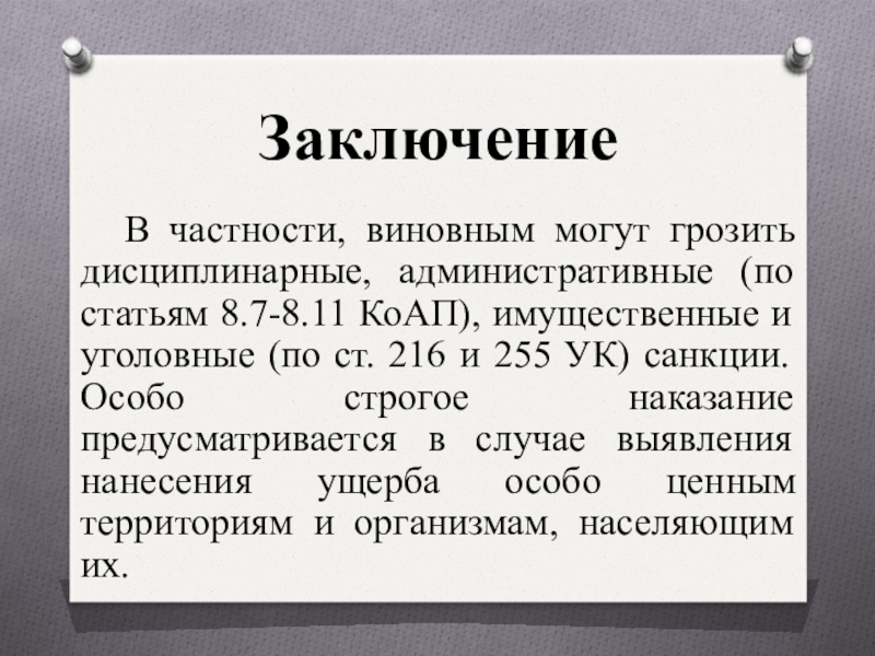 КоАП), имущественные и уголовные (по ст. 216 и 255 УК) санкции. Особо строгое наказание предусматривается в случае выявления нанесения ущерба особо ценным территориям и организмам, населяющим их.