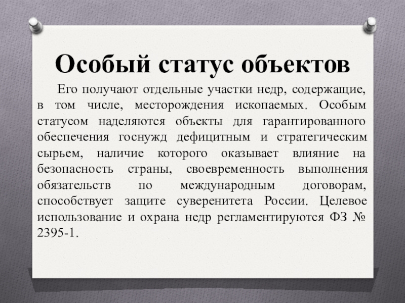 месторождения ископаемых. Особым статусом наделяются объекты для гарантированного обеспечения госнужд дефицитным и стратегическим сырьем, наличие которого оказывает влияние на безопасность страны, своевременность выполнения обязательств по международным договорам, способствует защите суверенитета России. Целевое использование и охрана недр регламентируются ФЗ № 2395-1.