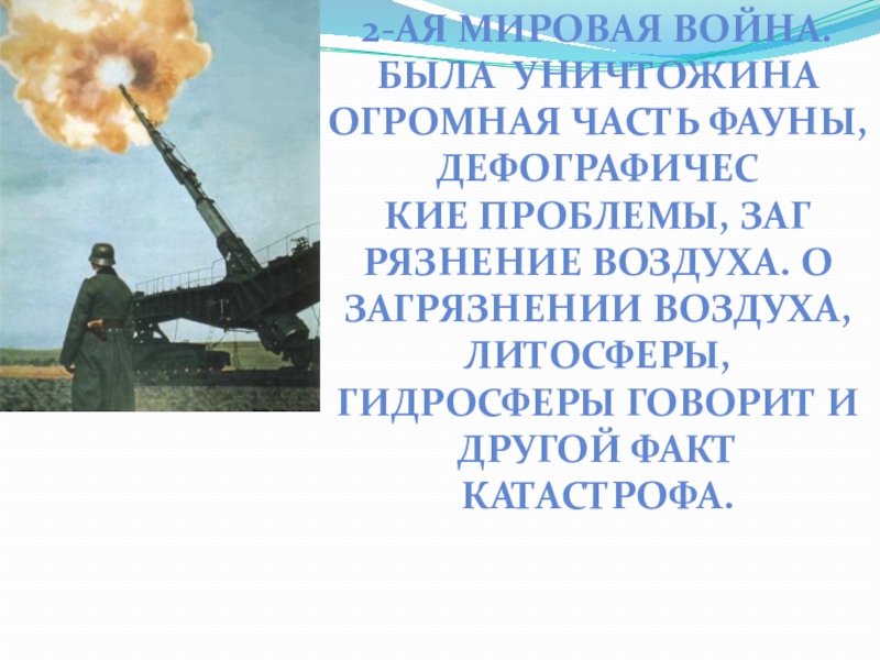 2-ая мировая война. Была уничтожина огромная часть фауны,дефографичесКие проблемы, загРязнение воздуха. О загрязнении воздуха, литосферы, гидросферы говорит
