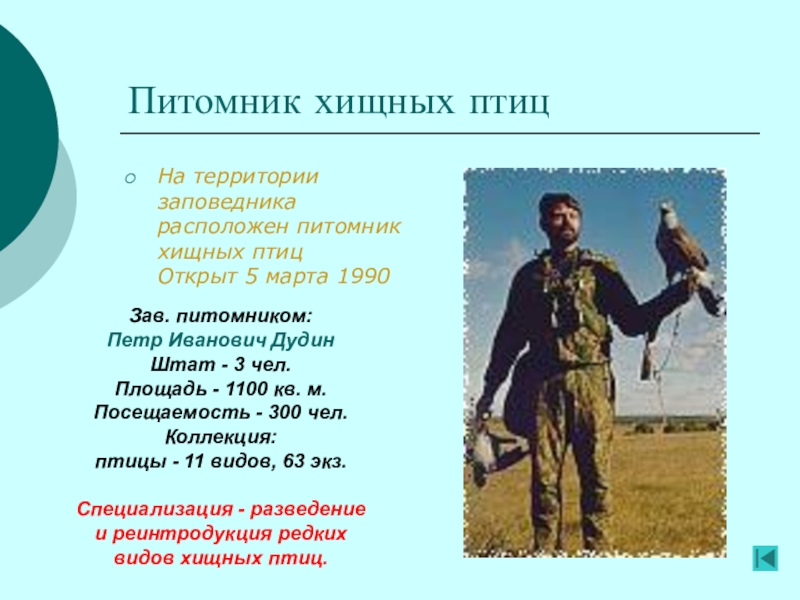 Специализация - разведение и реинтродукция редких видов хищных птиц.
