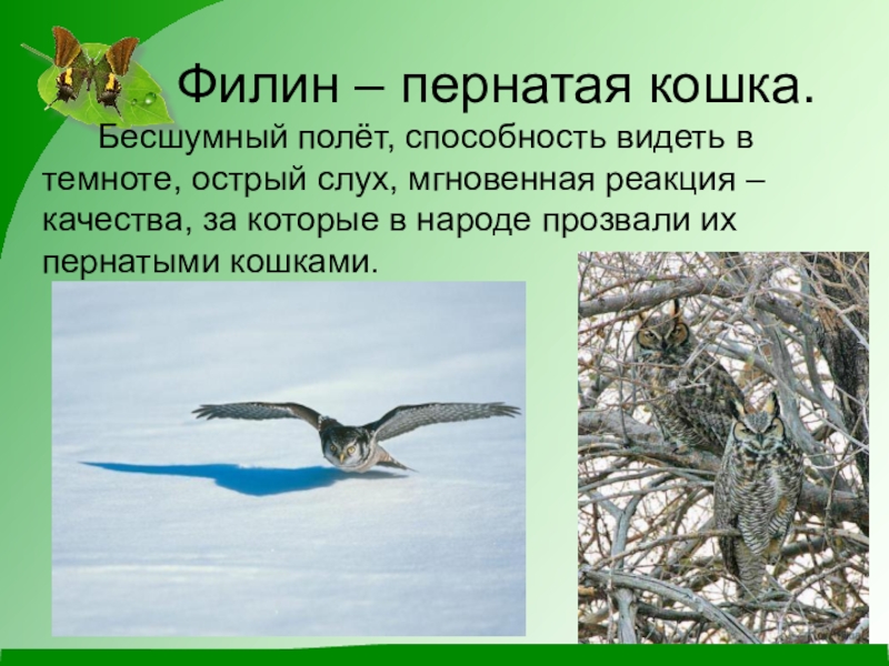 Филин – пернатая кошка.		Бесшумный полёт, способность видеть в темноте, острый слух, мгновенная реакция – качества, за которые