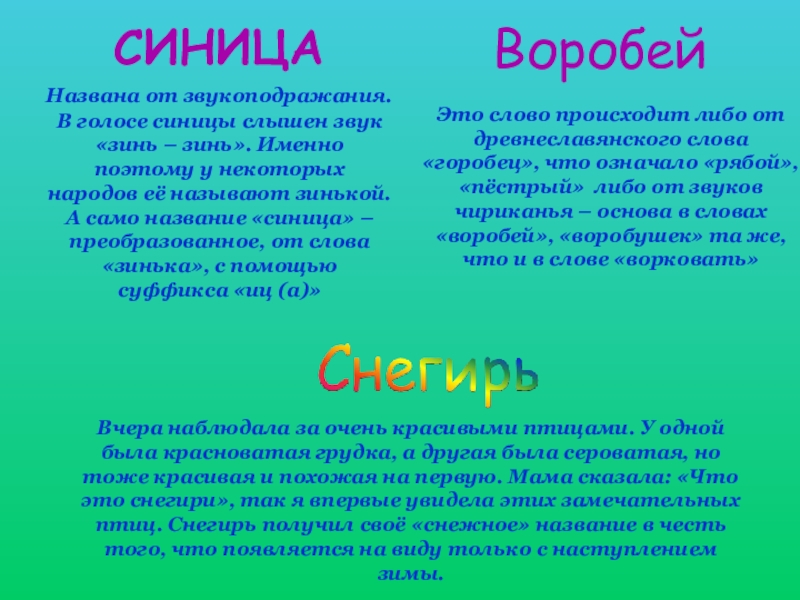 Это слово происходит либо от древнеславянского слова «горобец», что означало «рябой», «пёстрый» либо от звуков чириканья – основа в словах «воробей», «воробушек» та же, что и в слове «ворковать»
