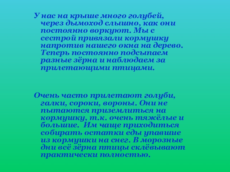 Вчера наблюдала за очень красивыми птицами. У одной была красноватая грудка, а другая была сероватая, но тоже красивая и похожая на первую. Мама сказала: «Что это снегири», так я впервые увидела этих замечательных птиц. Снегирь получил своё «снежное» название в честь того, что появляется на виду только с наступлением зимы.