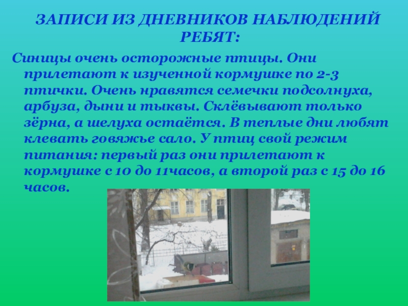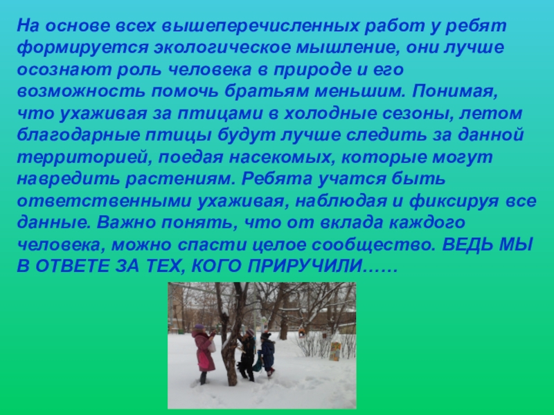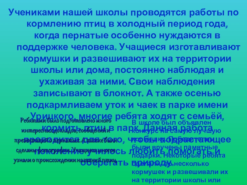 В школе был объявлен конкурс на самую лучшую кормушку. Победителям были вручены памятные подарки. Некоторые ребята сделали по несколько кормушек и развешивали их на территории школы или около дома продолжая за ними ухаживать.