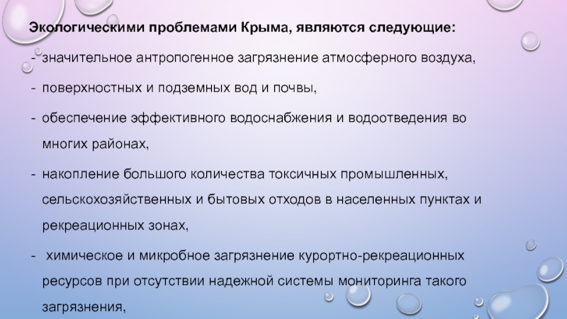 Экологическими проблемами Крыма, являются следующие: значительное антропогенное загрязнение атмосферного воздуха,поверхностных и подземных вод и почвы,обеспечение эффективного водоснабжения