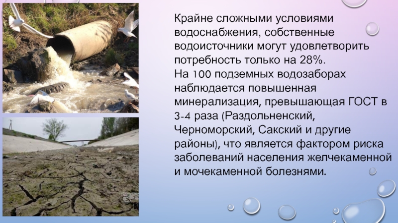 Слайд 4Крайне сложными условиями водоснабжения, собственные водоисточники могут удовлетворить потребность только на