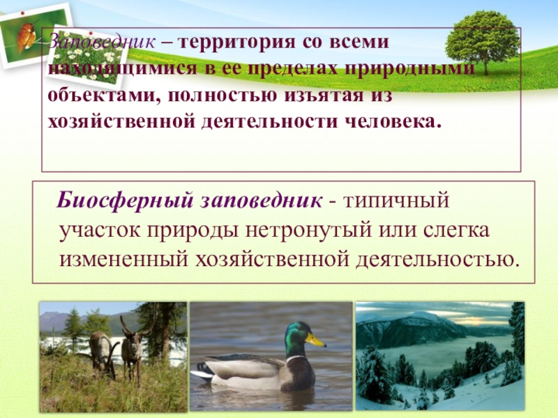 Биосферный заповедник - типичный участок природы нетронутый или слегка измененный хозяйственной деятельностью.