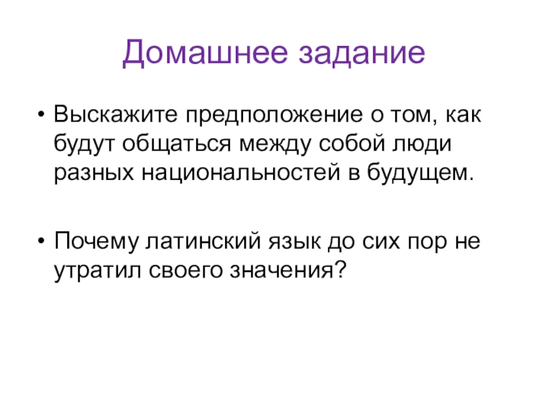 Домашнее заданиеВыскажите предположение о том, как будут общаться между собой люди разных национальностей в будущем.Почему латинский язык