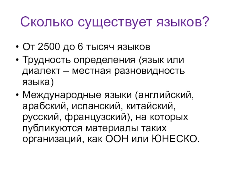 Сколько существует языков?От 2500 до 6 тысяч языковТрудность определения (язык или диалект – местная разновидность языка)Международные языки