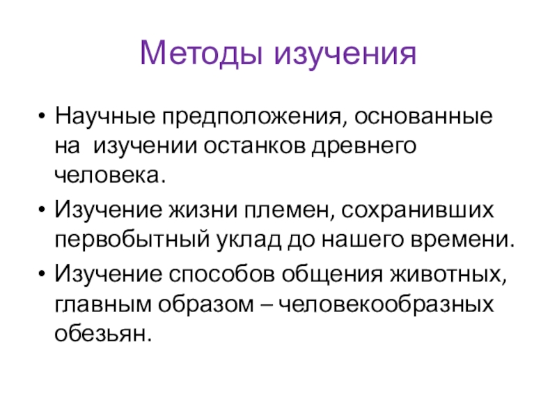 Методы изученияНаучные предположения, основанные на изучении останков древнего человека.Изучение жизни племен, сохранивших первобытный уклад до нашего времени.Изучение