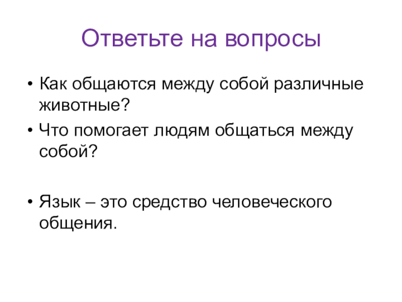 Ответьте на вопросыКак общаются между собой различные животные?Что помогает людям общаться между собой?Язык – это средство человеческого