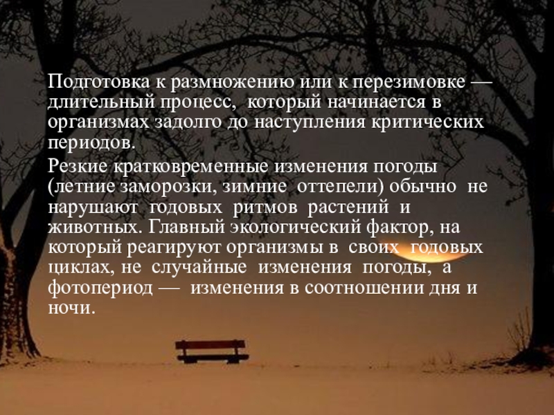 Резкие кратковременные изменения погоды (летние заморозки, зимние оттепели) обычно не нарушают годовых ритмов растений и животных. Главный экологический фактор, на который реагируют организмы в своих годовых циклах, не случайные изменения погоды, а фотопериод — изменения в соотношении дня и ночи.