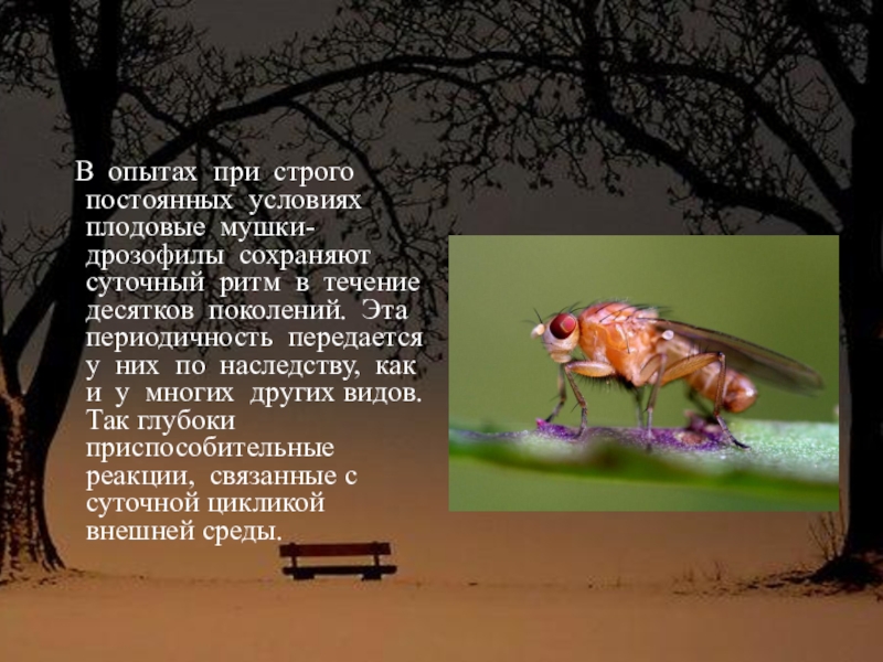 Слайд 9 В опытах при строго постоянных условиях плодовые мушки-дрозофилы сохраняют
