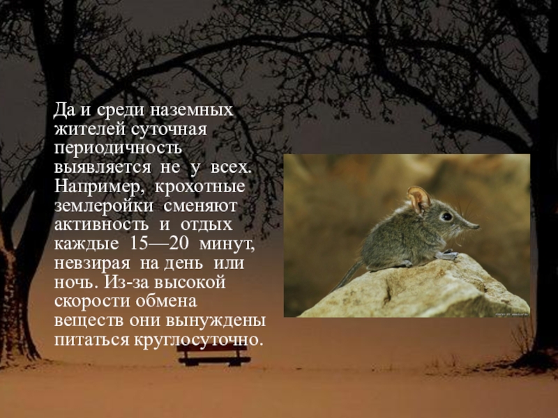 у всех. Например, крохотные землеройки сменяют активность и отдых каждые 15—20 минут, невзирая на день или ночь. Из-за высокой скорости обмена веществ они вынуждены питаться круглосуточно.