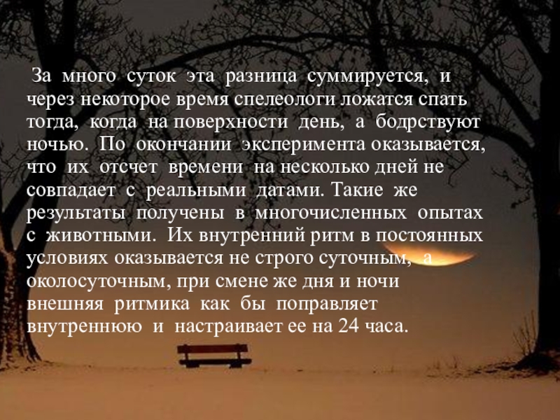 некоторое время спелеологи ложатся спать тогда, когда на поверхности день, а бодрствуют ночью. По окончании эксперимента оказывается, что их отсчет времени на несколько дней не совпадает с реальными датами. Такие же результаты получены в многочисленных опытах с животными. Их внутренний ритм в постоянных условиях оказывается не строго суточным, а околосуточным, при смене же дня и ночи внешняя ритмика как бы поправляет внутреннюю и настраивает ее на 24 часа.