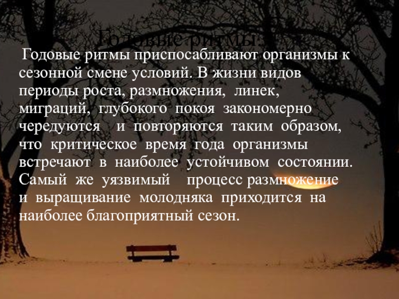 смене условий. В жизни видов периоды роста, размножения, линек, миграций, глубокого покоя закономерно чередуются и повторяются таким образом, что критическое время года организмы встречают в наиболее устойчивом состоянии. Самый же уязвимый процесс размножение и выращивание молодняка приходится на наиболее благоприятный сезон.
