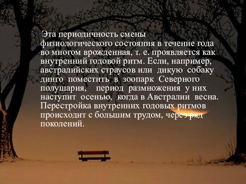 во многом врожденная, т. е. проявляется как внутренний годовой ритм. Если, например, австралийских страусов или дикую собаку динго поместить в зоопарк Северного полушария, период размножения у них наступит осенью, когда в Австралии весна. Перестройка внутренних годовых ритмов происходит с большим трудом, через ряд поколений.