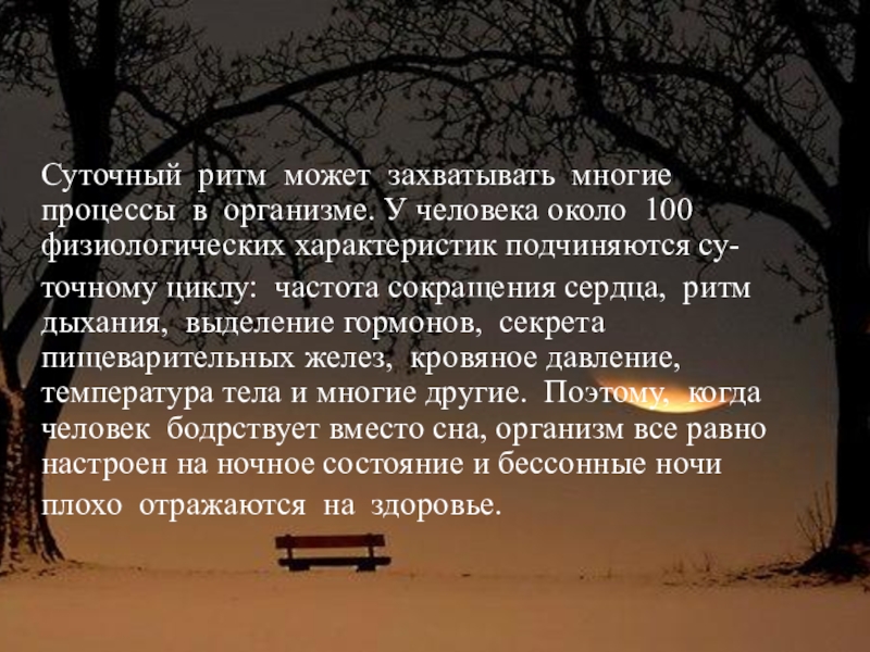 точному циклу: частота сокращения сердца, ритм дыхания, выделение гормонов, секрета пищеварительных желез, кровяное давление, температура тела и многие другие. Поэтому, когда человек бодрствует вместо сна, организм все равно настроен на ночное состояние и бессонные ночи