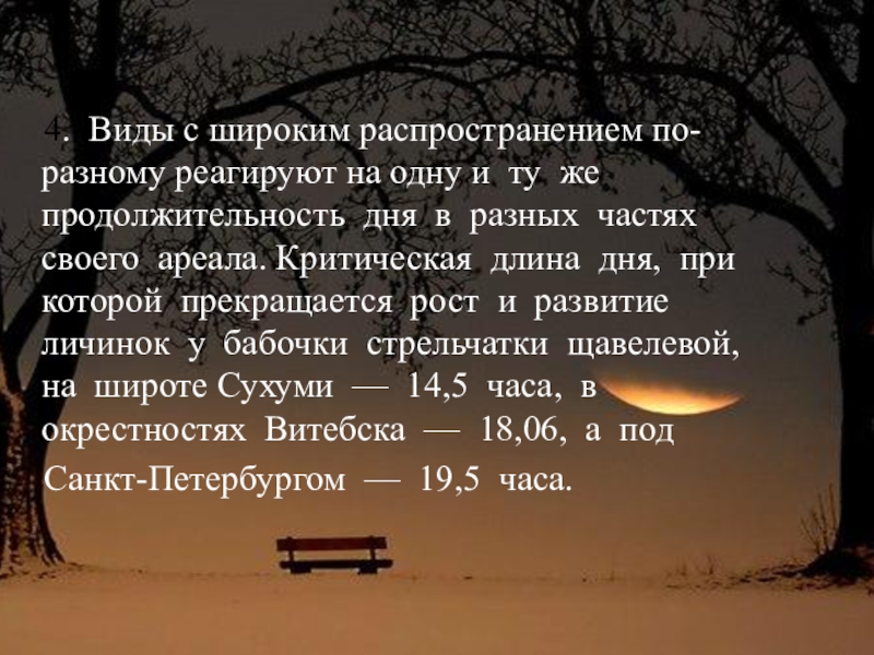 и ту же продолжительность дня в разных частях своего ареала. Критическая длина дня, при которой прекращается рост и развитие личинок у бабочки стрельчатки щавелевой, на широте Сухуми — 14,5 часа, в окрестностях Витебска — 18,06, а под