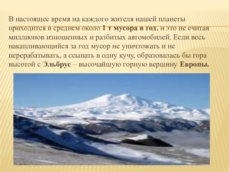 около 1 т мусора в год, и это не считая миллионов изношенных и разбитых автомобилей. Если весь накапливающийся за год мусор не уничтожать и не перерабатывать, а ссыпать в одну кучу, образовалась бы гора высотой с Эльбрус – высочайшую горную вершину Европы.