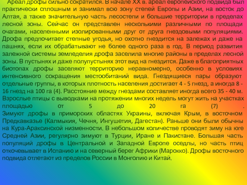 а местами и полное исчезновение пригодных биотопов. Сплошная распашка степей, на месте которых возникли огромные массивы полей, и интенсивный выпас скота на немногих сохранившихся пастбищах лишили дроф угодий, пригодных для гнездования. Возникновение густой сети автомобильных дорог с оживленным движением транспорта усилило фактор беспокойства. Многократная обработка полей, при которой вспугивают с гнезд насиживающих самок, вызывает гибель кладок, которые расклевывают следующие за трактором грачи, под машинами часто гибнут птенцы. Применение пестицидов не только вызывает иногда отравление птиц, но и лишает их животных кормов (насекомых). Названные причины снижают численность дроф и приводят к сокращению их ареала.