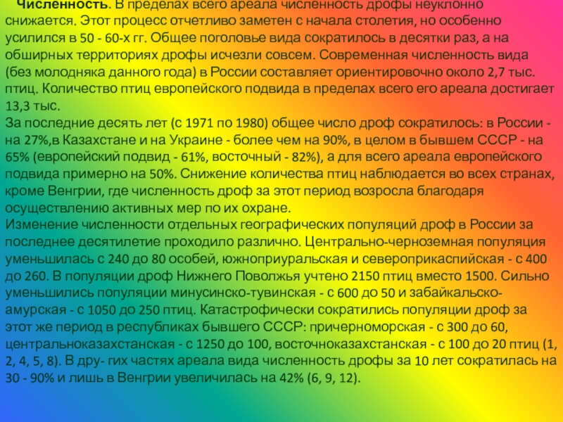 Слайд 13Численность. В пределах всего ареала численность дрофы неуклонно снижается. Этот процесс