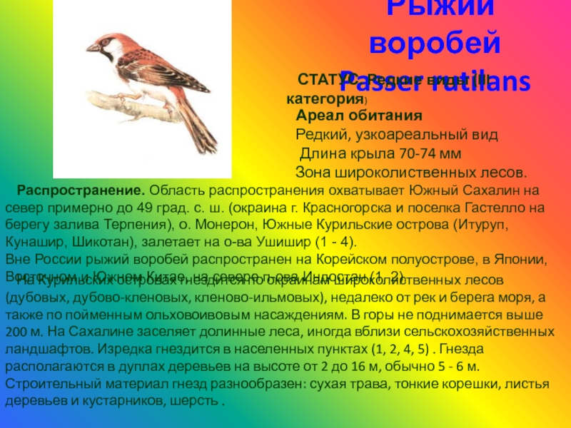 На Сахалине и о. Шикотан рыжий воробей встречается только в долинных