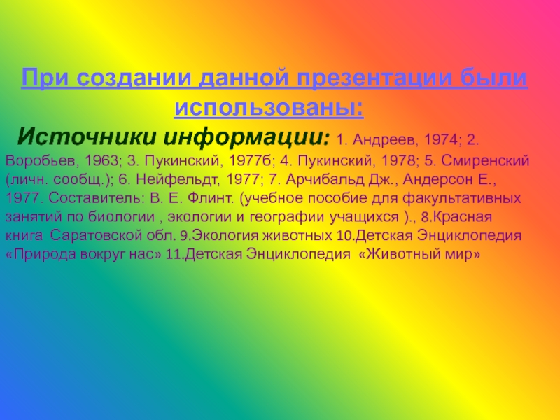 Воробьев, 1963; 3. Пукинский, 1977б; 4. Пукинский, 1978; 5. Смиренский (личн. сообщ.); 6. Нейфельдт, 1977; 7. Арчибальд Дж., Андерсон Е., 1977. Составитель: В. Е. Флинт. (учебное пособие для факультативных занятий по биологии , экологии и географии учащихся )., 8.Красная книга Саратовской обл. 9.Экология животных 10.Детская Энциклопедия «Природа вокруг нас» 11.Детская Энциклопедия «Животный мир»