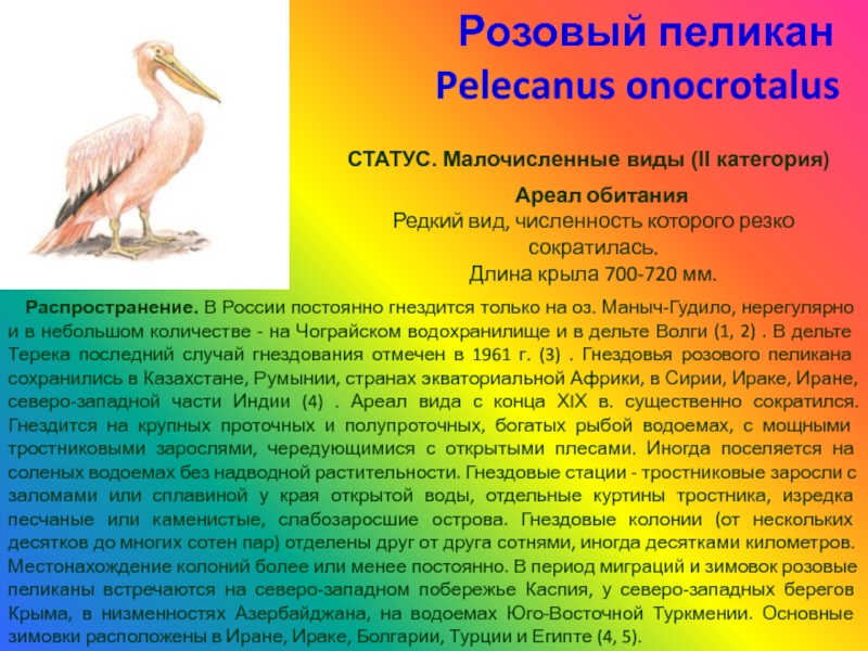 Распространение. В России постоянно гнездится только на оз. Маныч-Гудило, нерегулярно и в небольшом количестве - на Чограйском водохранилище и в дельте Волги (1, 2) . В дельте Терека последний случай гнездования отмечен в 1961 г. (3) . Гнездовья розового пеликана сохранились в Казахстане, Румынии, странах экваториальной Африки, в Сирии, Ираке, Иране, северо-западной части Индии (4) . Ареал вида с конца ХIХ в. существенно сократился.