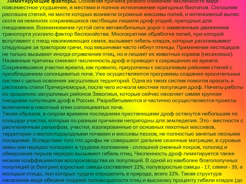 Слайд 14Лимитирующие факторы. Основная причина резкого снижения численности вида - повсеместное ухудшение,