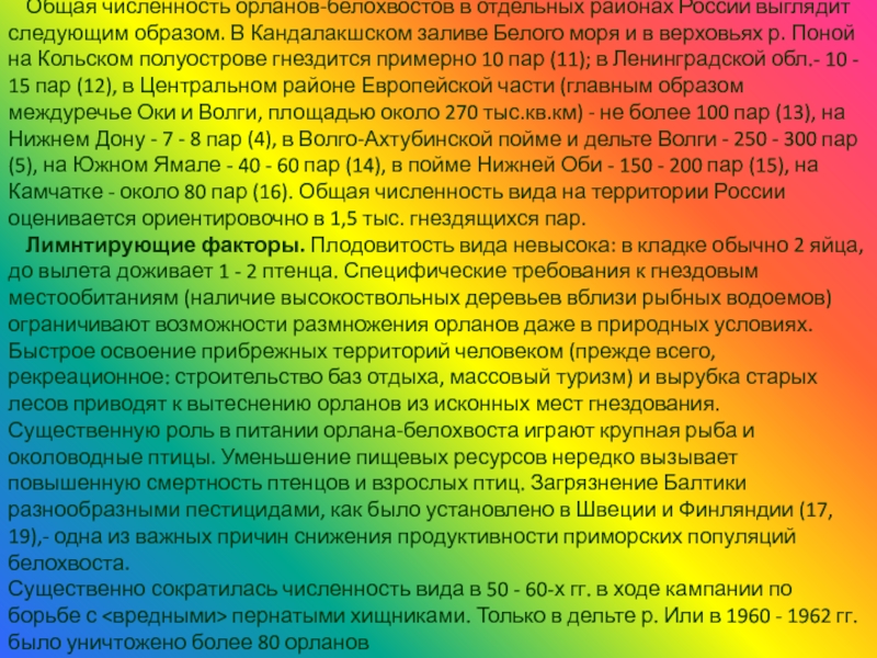 Слайд 9Общая численность орланов-белохвостов в отдельных районах России выглядит следующим образом. В