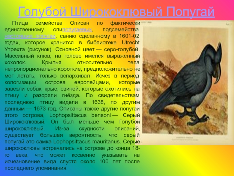 настоящие попугаи. санию сделанному в 1601-02 годах, которое хранится в библиотеке Utrecht Утрехта (рисунок). Основной цвет — серо-голубой. Массивный клюв, на голове имелся выраженный хохолок. Крылья относительно тела непропорционально короткие, предположительно не мог летать, только вспархивал. Исчез в период кологизации острова европейцами, которые завезли собак, крыс, свиней, которые охотились на птицу и разоряли гнёзда. По свидетельствам последнюю птицу видели в 1638, по другим данным — 1673 год. Описаны также другие попугаи этого острова, Lophopsittacus bensoni — Серый Ширококлювый. Он был меньше чем Голубой ширококлювый. Из-за скудности описаний, существует большая вероятность, что серый попугай это самка Lophopsittacus mauritanus. Серые ширококлювы встречались на острове до конца 18-го века, что может косвенно указывать на исчезновение вида спустя около 100 лет после последнего упоминания.