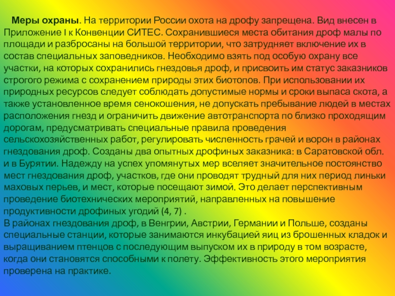 Слайд 15Меры охраны. На территории России охота на дрофу запрещена. Вид внесен