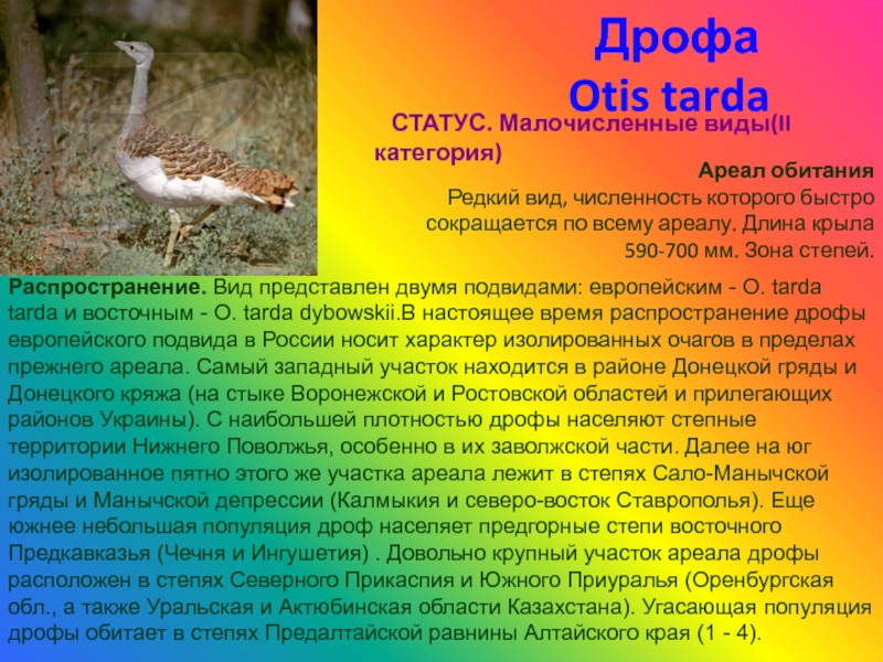 Распространение. Вид представлен двумя подвидами: европейским - О. tarda tarda и восточным - О. tarda dybowskii.В наcтоящее время распространение дрофы европейского подвида в России носит характер изолированных очагов в пределах прежнего ареала. Самый западный участок находится в районе Донецкой гряды и Донецкого кряжа (на стыке Воронежской и Ростовской областей и прилегающих районов Украины). С наибольшей плотностью дрофы населяют степные территории Нижнего Поволжья, особенно в их заволжской части. Далее на юг изолированное пятно этого же участка ареала лежит в степях Сало-Манычской гряды и Манычской депрессии (Калмыкия и северо-восток Ставрополья). Еще южнее небольшая популяция дроф населяет предгорные степи восточного Предкавказья (Чечня и Ингушетия) . Довольно крупный участок ареала дрофы расположен в степях Северного Прикаспия и Южного Приуралья (Оренбургская обл., а также Уральская и Актюбинская области Казахстана). Угасающая популяция дрофы обитает в степях Предалтайской равнины Алтайского края (1 - 4).