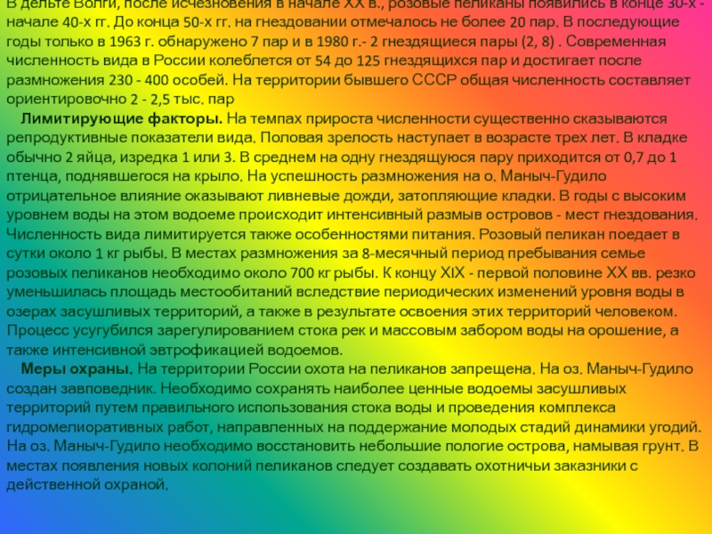 Лимитирующие факторы. На темпах прироста численности существенно сказываются репродуктивные показатели вида. Половая зрелость наступает в возрасте трех лет. В кладке обычно 2 яйца, изредка 1 или 3. В среднем на одну гнездящуюся пару приходится от 0,7 до 1 птенца, поднявшегося на крыло. На успешность размножения на о. Маныч-Гудило отрицательное влияние оказывают ливневые дожди, затопляющие кладки. В годы с высоким уровнем воды на этом водоеме происходит интенсивный размыв островов - мест гнездования. Численность вида лимитируется также особенностями питания. Розовый пеликан поедает в сутки около 1 кг рыбы. В местах размножения за 8-месячный период пребывания семье розовых пеликанов необходимо около 700 кг рыбы. К концу ХIХ - первой половине ХХ вв. резко уменьшилась площадь местообитаний вследствие периодических изменений уровня воды в озерах засушливых территорий, а также в результате освоения этих территорий человеком. Процесс усугубился зарегулированием стока рек и массовым забором воды на орошение, а также интенсивной эвтрофикацией водоемов.