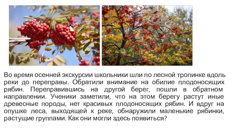 до переправы. Обратили внимание на обилие плодоносящих рябин. Переправившись на другой берег, пошли в обратном направлении. Ученики заметили, что на этом берегу растут иные древесные породы, нет красивых плодоносящих рябин. И вдруг на опушке леса, выходящей к реке, обнаружили маленькие рябинки, растущие группами. Как они могли здесь появиться?