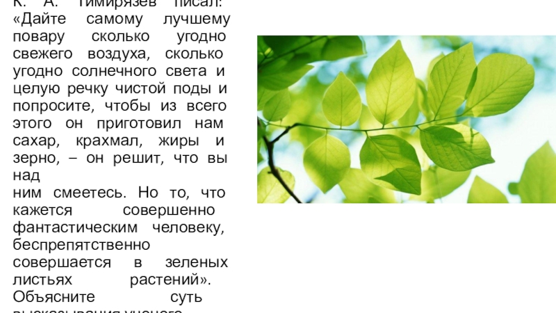 Слайд 3К. А. Тимирязев писал: «Дайте самому лучшему повару сколько угодно свежего