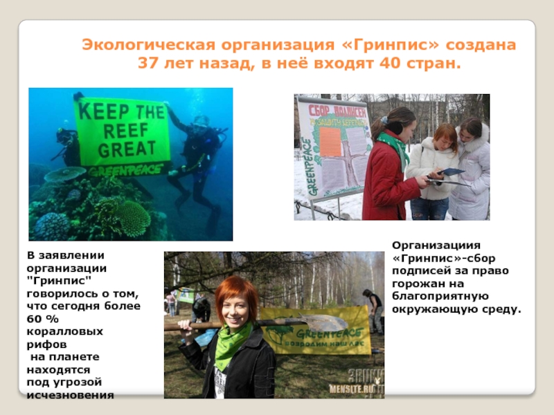 Организациия «Гринпис»-сбор подписей за право горожан на благоприятную окружающую среду.