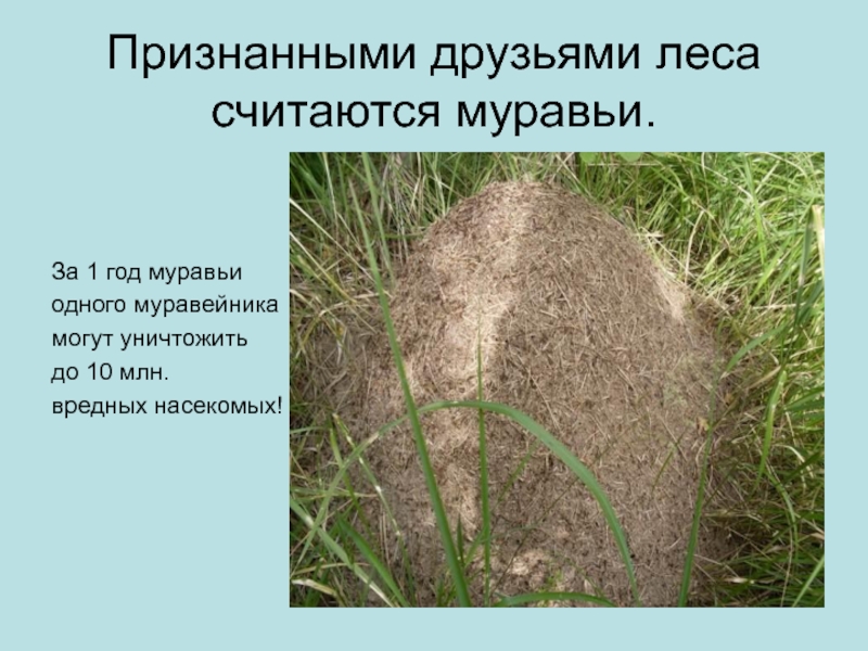 Признанными друзьями леса считаются муравьи.За 1 год муравьи одного муравейника могут уничтожить до 10 млн. вредных насекомых!