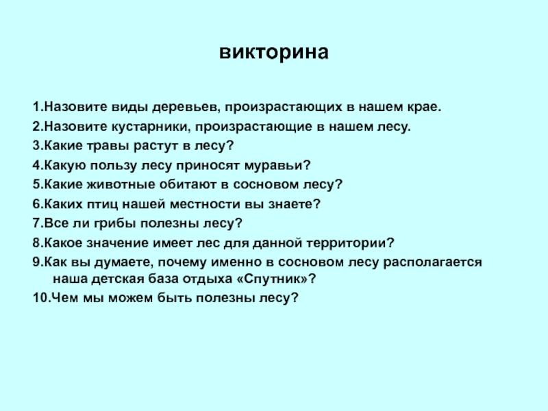 викторина1.Назовите виды деревьев, произрастающих в нашем крае.2.Назовите кустарники, произрастающие в нашем лесу.3.Какие травы растут в лесу?4.Какую пользу