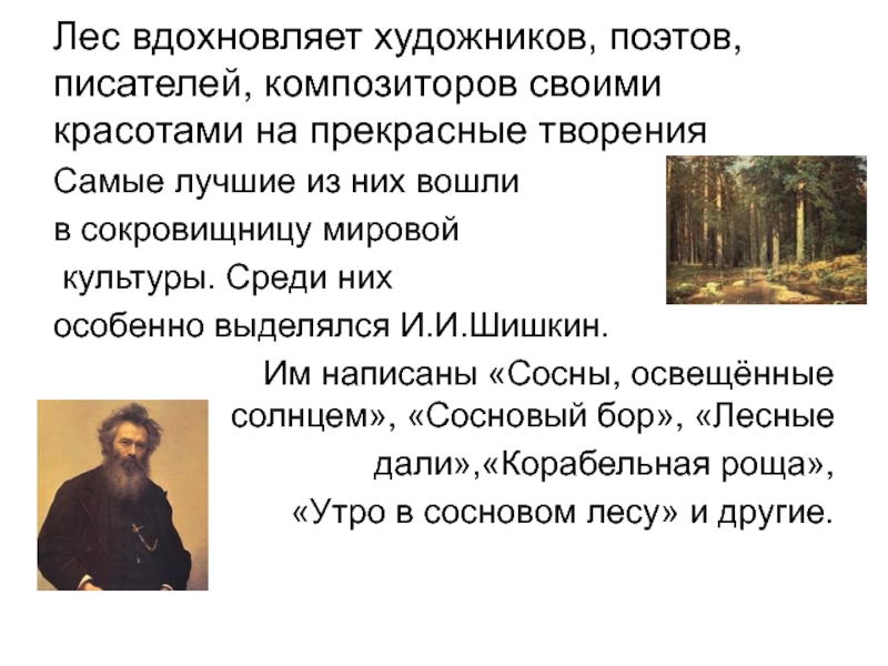 Слайд 13Лес вдохновляет художников, поэтов, писателей, композиторов своими красотами на прекрасные творения