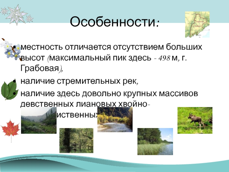 Особенности:местность отличается отсутствием больших высот (максимальный пик здесь - 498 м, г. Грабовая), наличие стремительных рек,наличие здесь