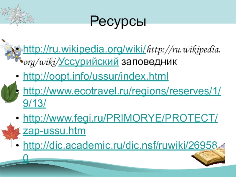 Ресурсыhttp://ru.wikipedia.org/wiki/http://ru.wikipedia.org/wiki/Уссурийский заповедникhttp://oopt.info/ussur/index.htmlhttp://www.ecotravel.ru/regions/reserves/1/9/13/http://www.fegi.ru/PRIMORYE/PROTECT/zap-ussu.htmhttp://dic.academic.ru/dic.nsf/ruwiki/269580