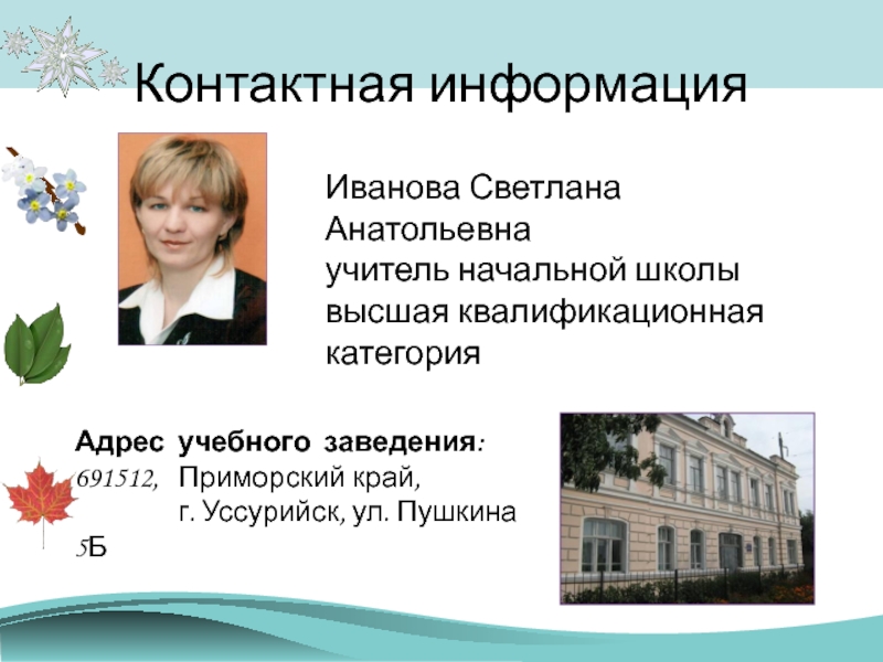 Контактная информацияИванова Светлана Анатольевнаучитель начальной школы высшая квалификационная категорияАдрес учебного заведения:691512,  Приморский край,