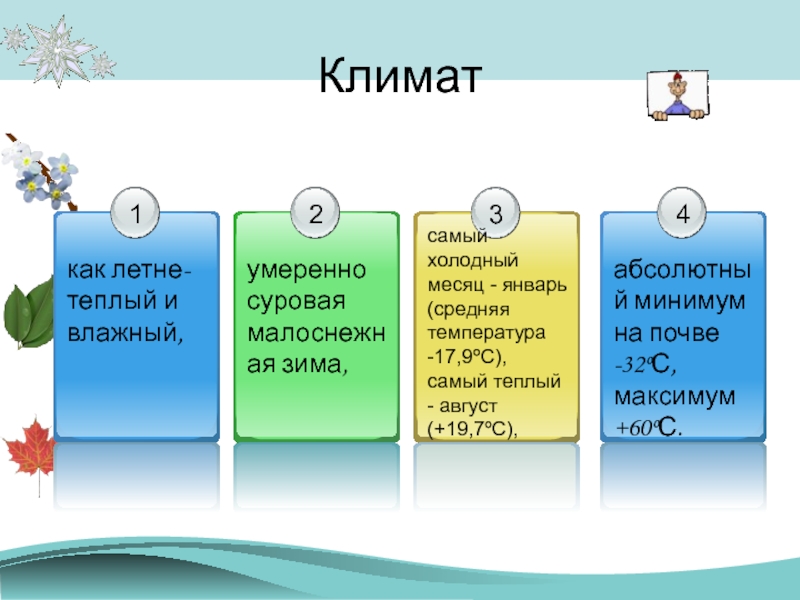 Климатсамый холодный месяц - январь (средняя температура -17,9ºС), самый теплый - август (+19,7ºС),