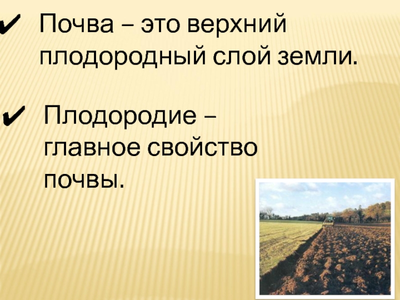 Почва – это верхний плодородный слой земли.Плодородие – главное свойство почвы.
