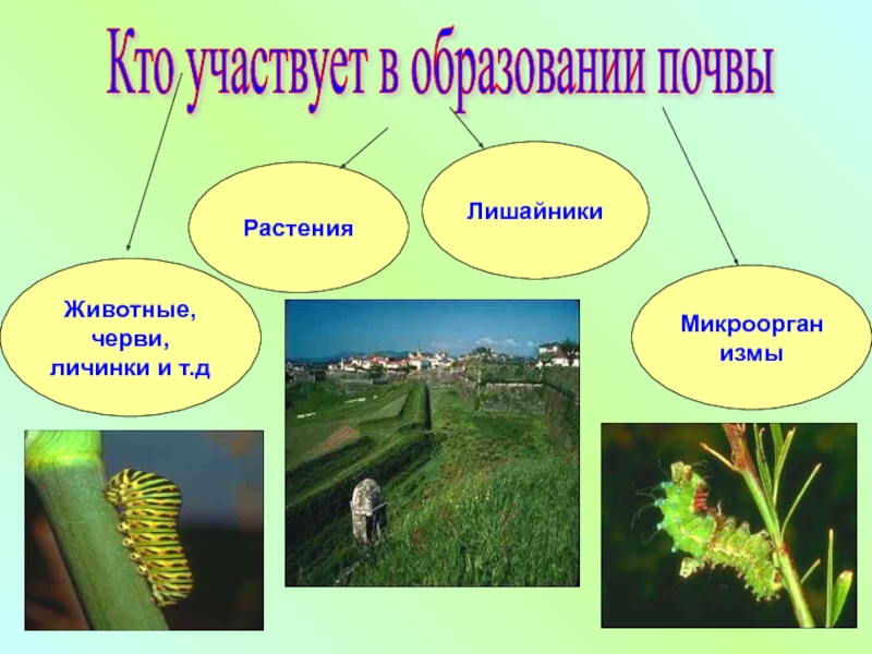 Кто участвует в образовании почвы РастенияЖивотные, черви,личинки и т.дЛишайникиМикроорганизмы