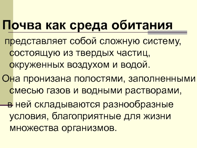 Почва как среда обитания представляет собой сложную систему, состоящую из твердых частиц, окруженных воздухом и
