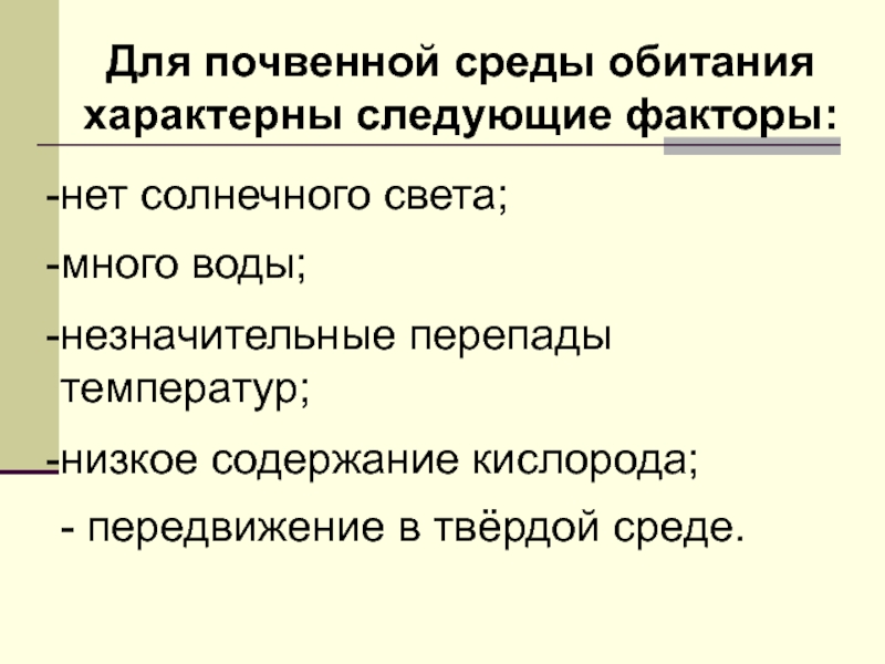 Для почвенной среды обитания характерны следующие факторы:нет солнечного света;много воды;незначительные перепады  температур;низкое содержание кислорода;- передвижение в