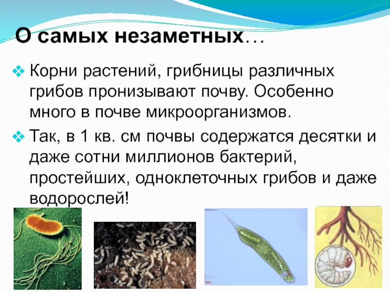 О самых незаметных…Корни растений, грибницы различных грибов пронизывают почву. Особенно много в почве микроорганизмов. Так, в 1